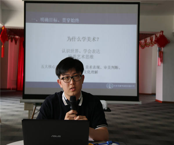 杨文健老师先提出问题“为什么学美术”,然后根据个人教学,与大家分享了美术课堂如何明确目标,研究学生,帮助学生认识世界、学会表达、培养艺术思维。