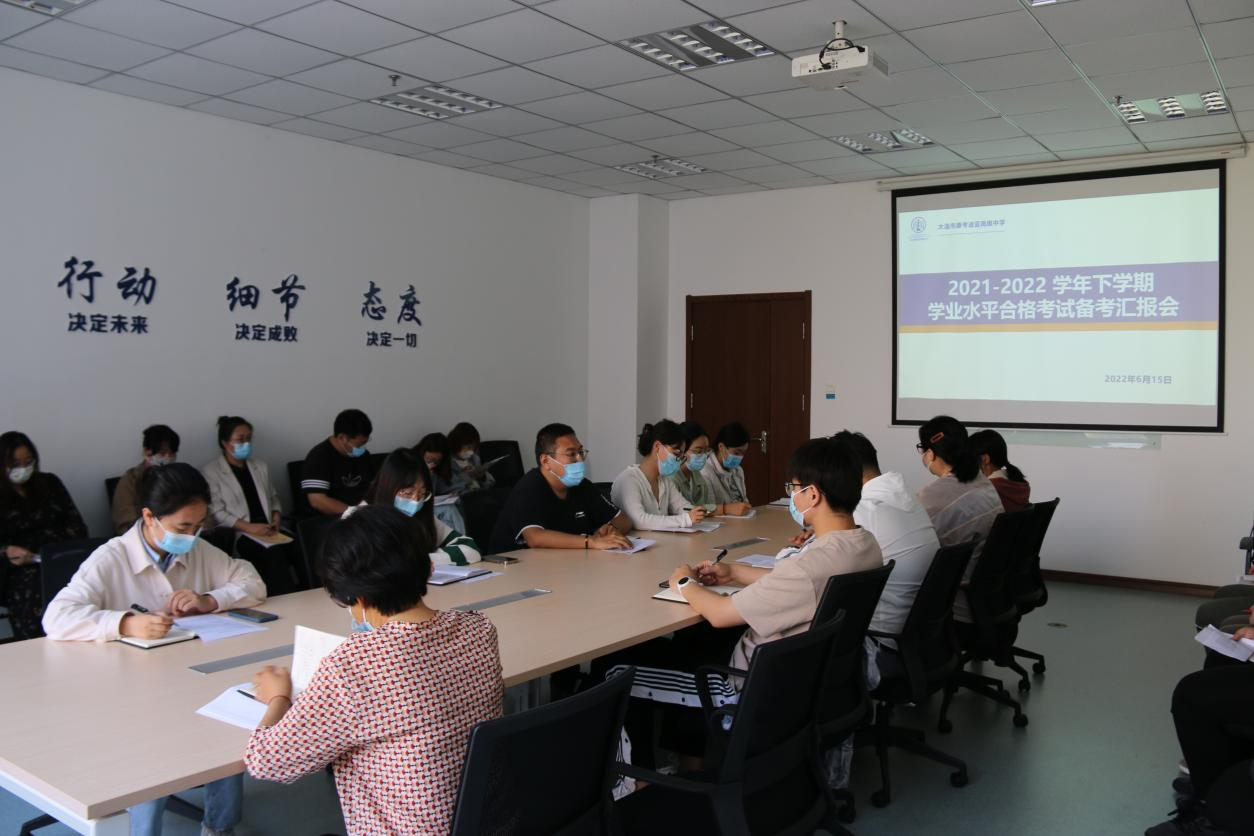 为了了解和掌握我校高一年级化学、历史、生物、地理学考科目教师备考情况,进一步加强学业水平合格考试备考工作,保证学生顺利通过考试,我校于2022年6月15日下午召开了高一年级四学科学业水平合格考试备考汇报会。本次会议由教学处张老师主持,学校领导、教学处人员、各相关学科教师及班主任参加本次会议。