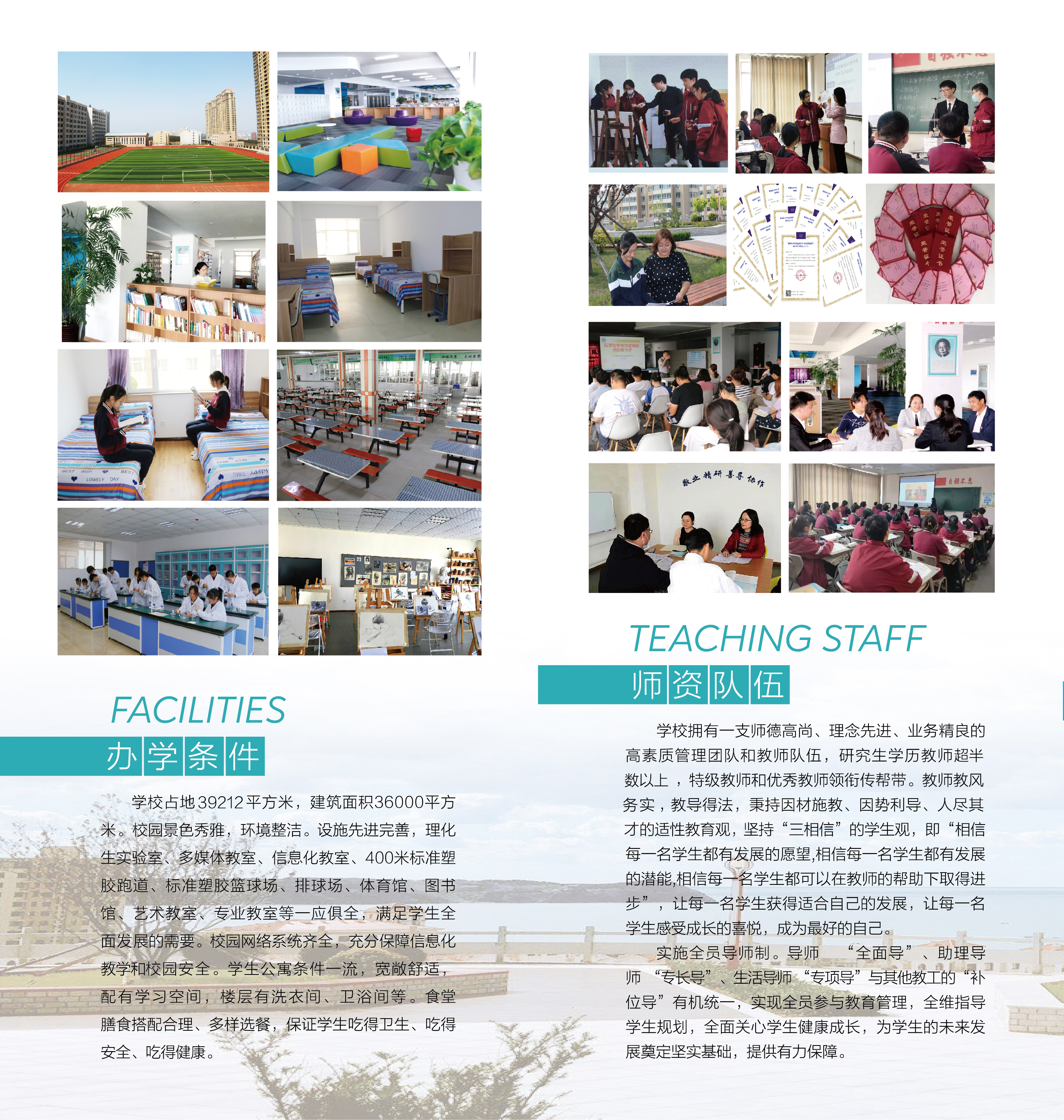 学校占地27000平方米,建筑面积36000平方米。校园景色秀雅,环境整洁。设施先进完善,理化生实验室、多媒体教室、信息化教室、400米标准塑胶跑道、标准塑胶篮球场、体育馆、图书馆、音乐厅、专业教室等一应俱全,满足学生全面发展的需要。校园网络系统齐全,充分保障信息化教学和校园安全。公寓条件一流,双人间带客厅,宽敞舒适,配有自习厅和洗衣间,适合生活和学习的不同需求。食堂膳食搭配合理、营养丰富、多样选餐,保证学生吃得卫生、吃得安全、吃得健康。