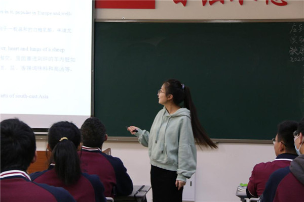 盖洁老师初登教坛,但对教学内容掌握熟练,上课有激情,引导学生层层阅读,理解文本,合作分享,从A Child of Two Cuisines的中英饮食差异了解,到学生各自家乡的美食介绍,学生语言运用能力得到训练和加强。