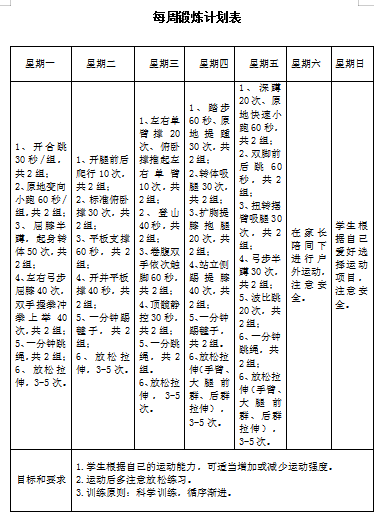 3.每天坚持锻炼不少于1小时,每次锻炼时间不少于30分钟,锻炼内容要综合考虑环境、时间、强度、次数等因素,保证锻炼效果。