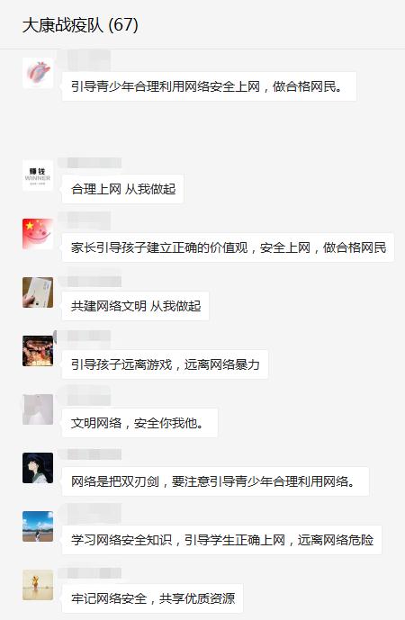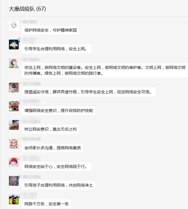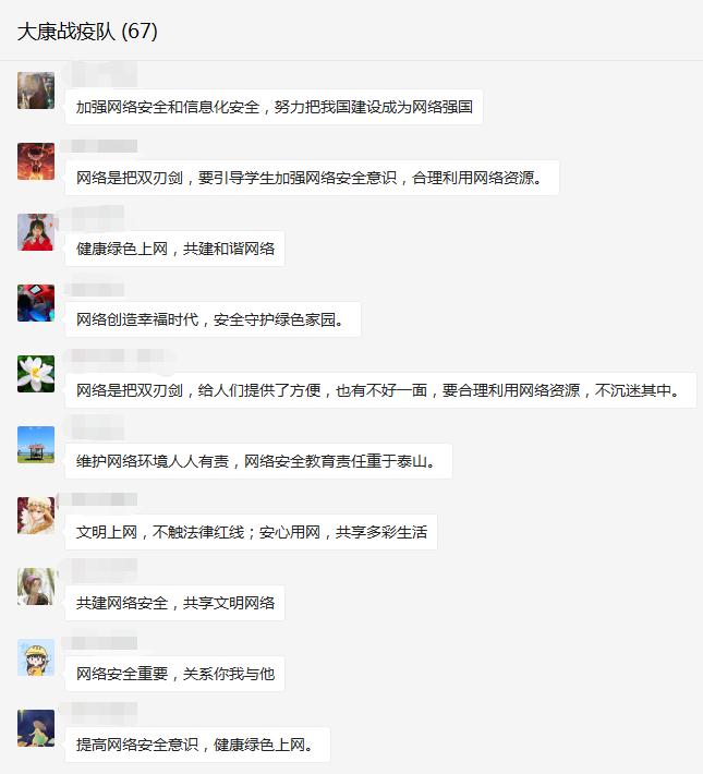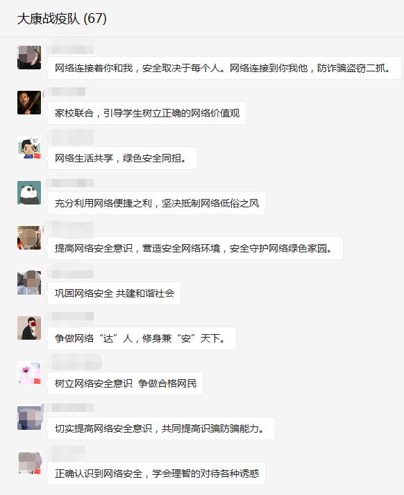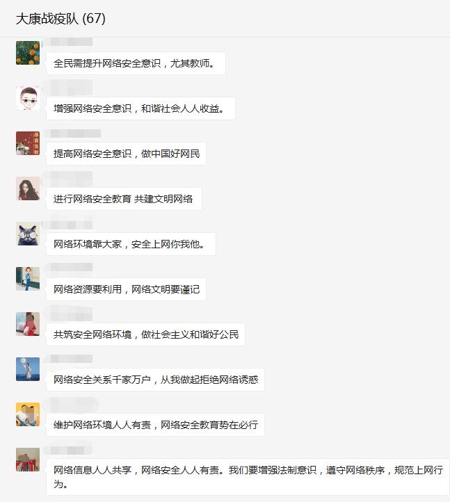 在教师工作群中转发了网络安全知识宣传的短视频,教职工观看后纷纷留言表示:维护网络环境人人有责,网络安全教育势在必行,要增强法制意识,遵守网络秩序,拒绝网络诱惑,防微杜渐,自觉抵制不安全的信息,在无限宽广的网络天地里倡导安全新风。