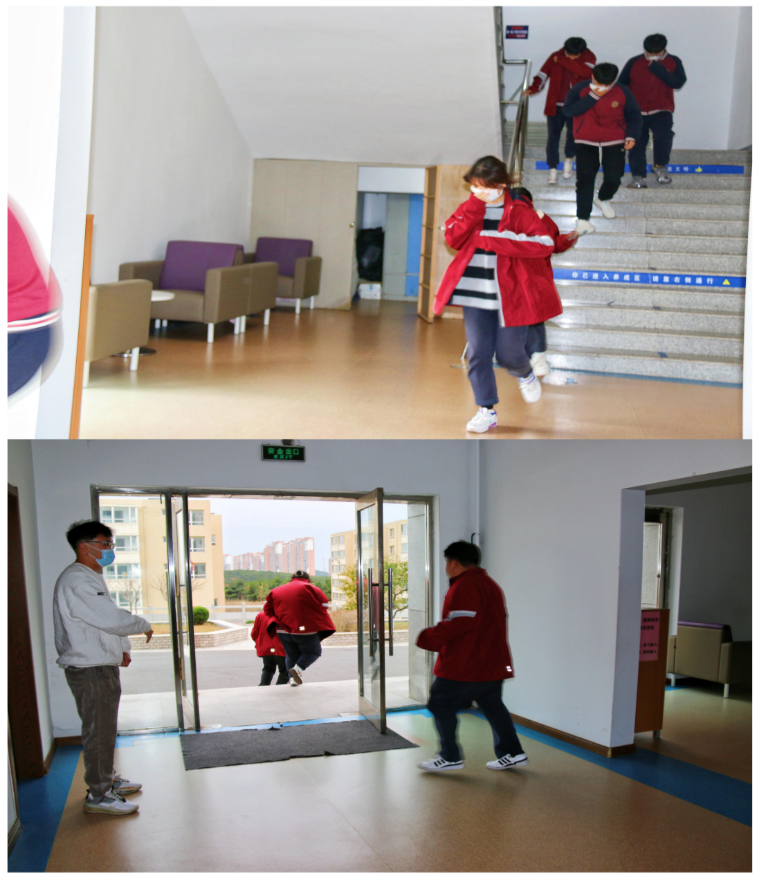 首先进行的是楼内突发火灾疏散演习。随着消防教官一声令下,警报铃声响起,疏散演习开始,高三同学们手捂口鼻,弯腰低姿,有序地从通道口撤离“火灾”现场。