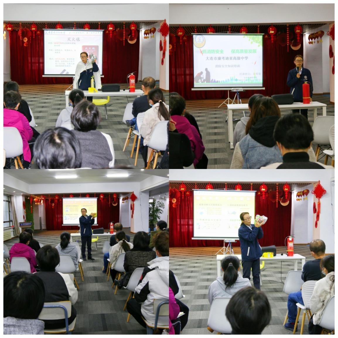 演习结束后,消防教官对教职工进行消防安全知识培训,讲解了疏散逃生的注意事项,并介绍了多种灭火器使用常识和灭火毯使用方法。