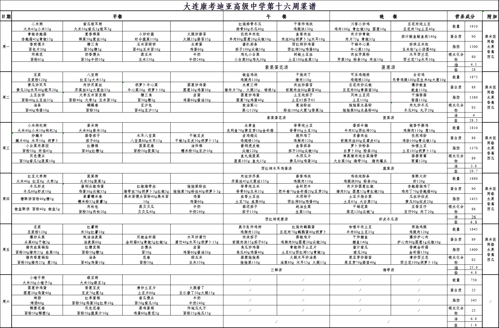 大连市康考迪亚高级中学第十六周食谱(6.16-6.21)