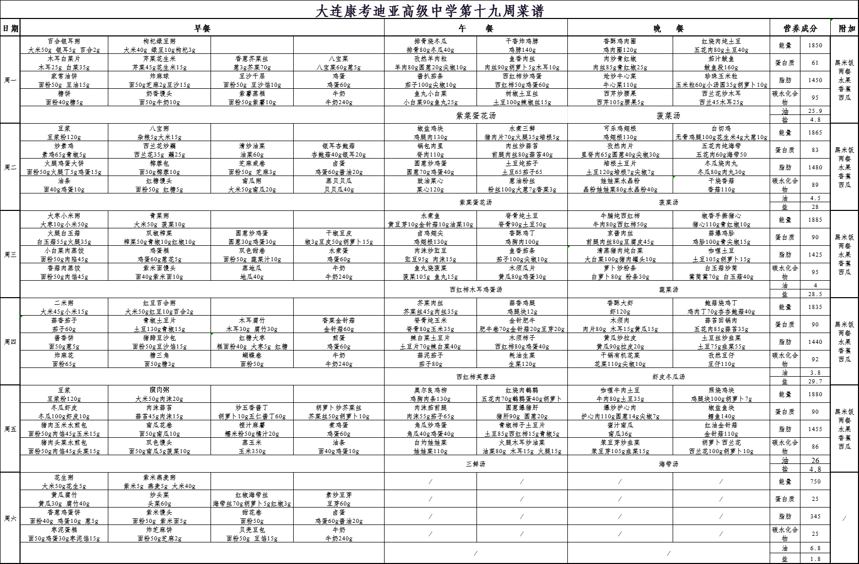 大连市康考迪亚高级中学第十九周食谱(7.7-7.12)
