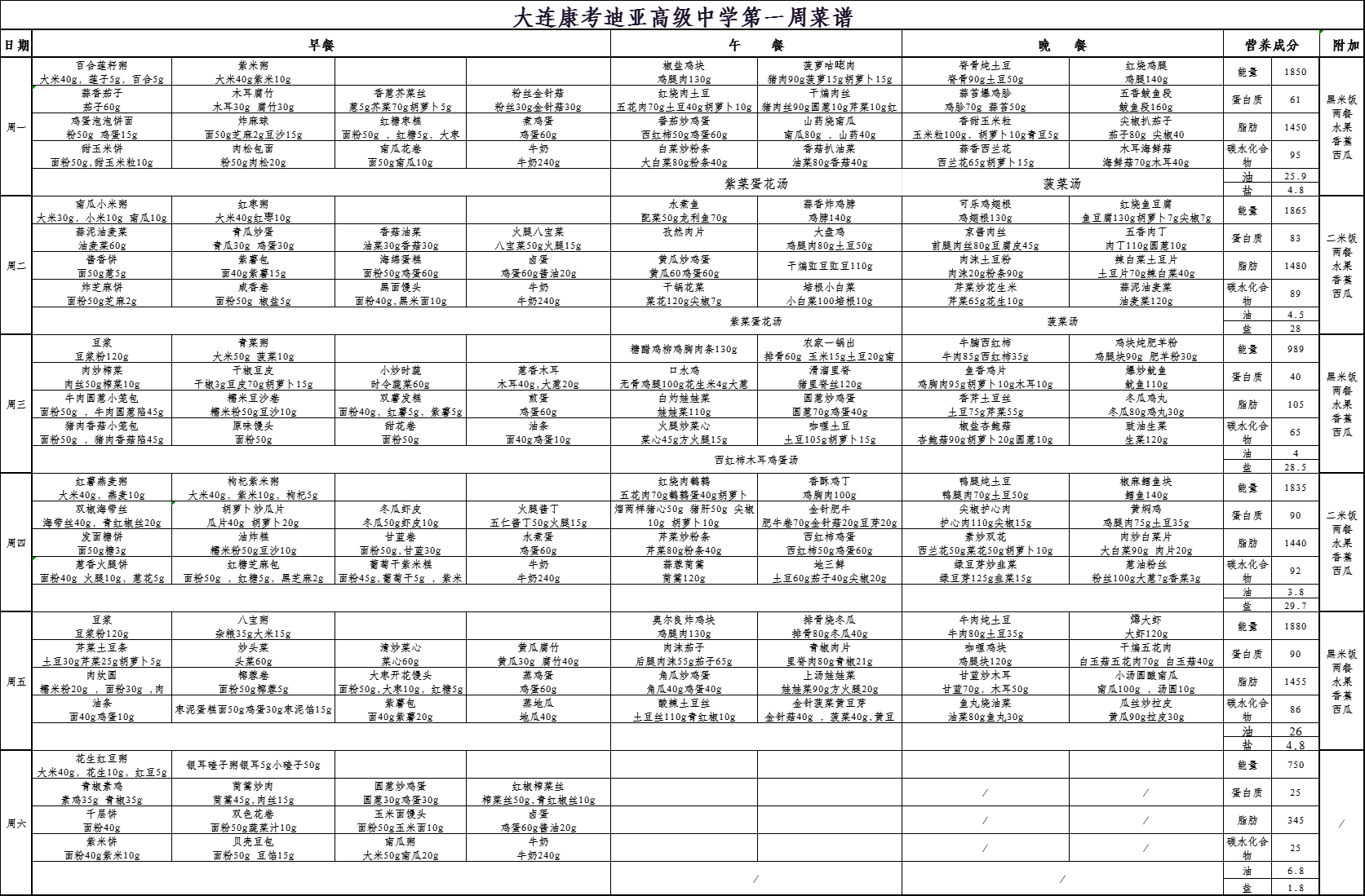 大连市康考迪亚高级中学第一周食谱(9.1-9.6)