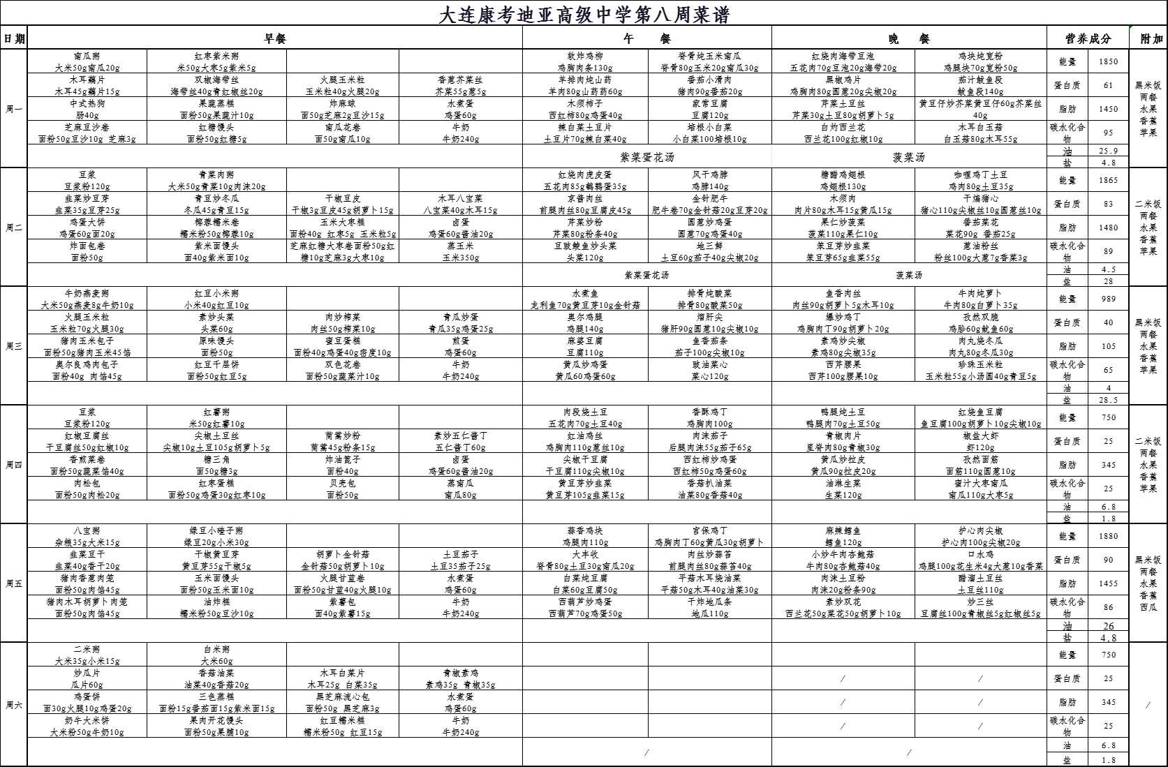 大连市康考迪亚高级中学第八周食谱(10.20-10.25)