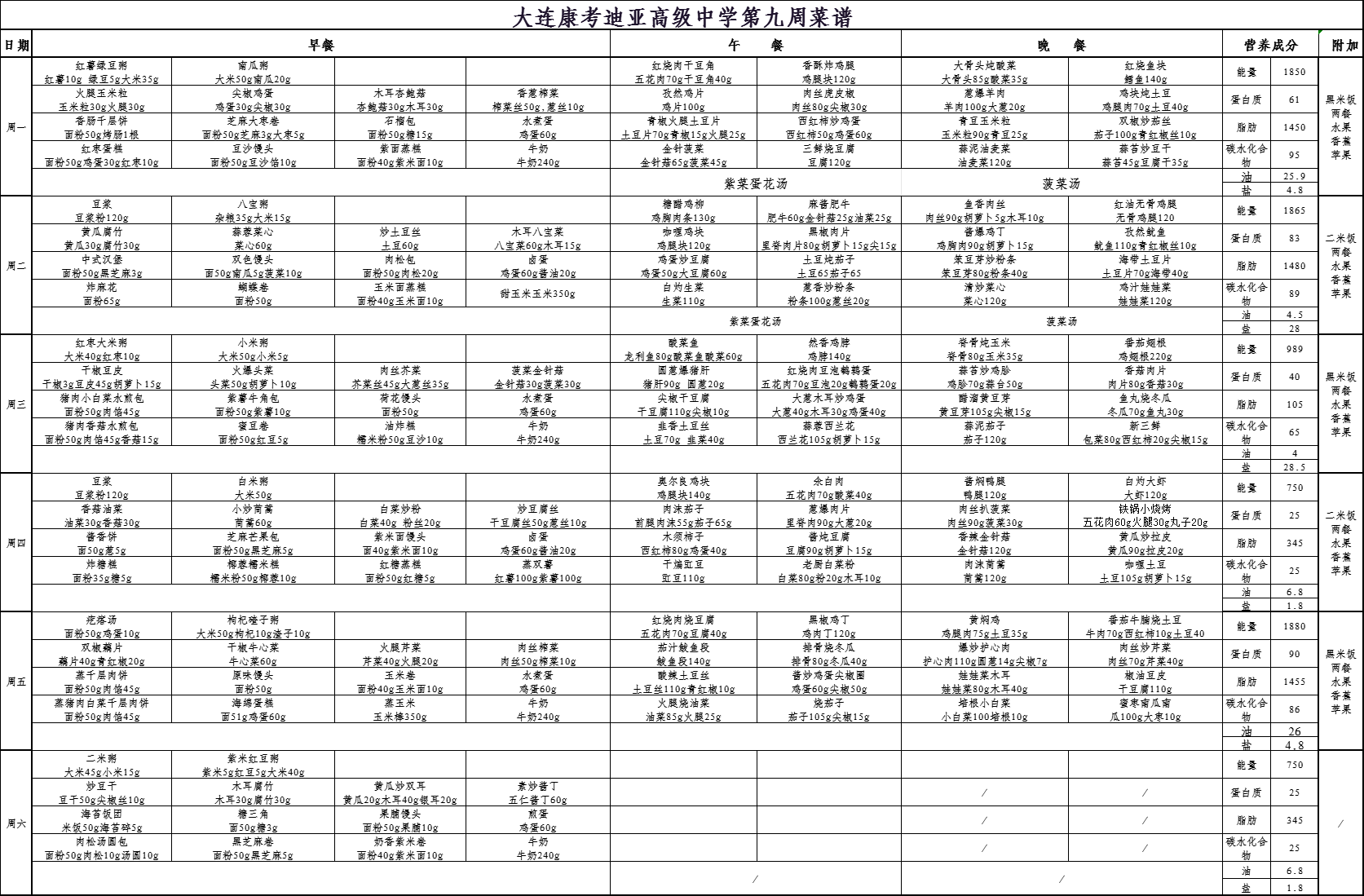 大连市康考迪亚高级中学第九周食谱(10.27-11.1)