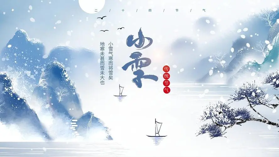 小每年11月22日或23日,视太阳到达黄经240°时为小雪(Light Snow)。“小雪”是反映天气现象的节令。小雪节气虽然叫“小雪”,但和气象学意义上的小雪却没有必然关联。小雪节气反应了气候特征,期间寒潮和冷空气一般活动比较频繁,但不一定下雪。“小雪不耕地,大雪不行船”。立冬之后,气温逐渐降低,人们感受到丝丝寒意,纷纷添衣保暖。而小雪的到来,则意味着中国北方已开始进入寒冰封冻的时节。《月令七十二候集解》中说:“10月中,雨下而为寒气所薄,故凝而为雪。小者未盛之辞。”古籍《群芳谱》中说:“小雪气寒而将雪矣,地寒未甚而雪未大也。”清代王士?G在《题<徐骑省集>后》有曰:“寂寥小雪闲中过,斑驳新霜鬓上加。”