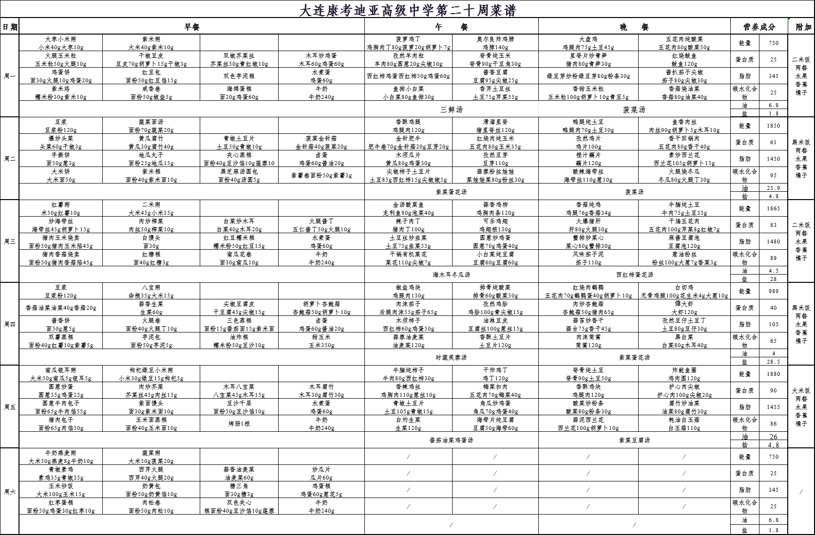 大连市康考迪亚高级中学第二十周食谱(1.12-1.17)