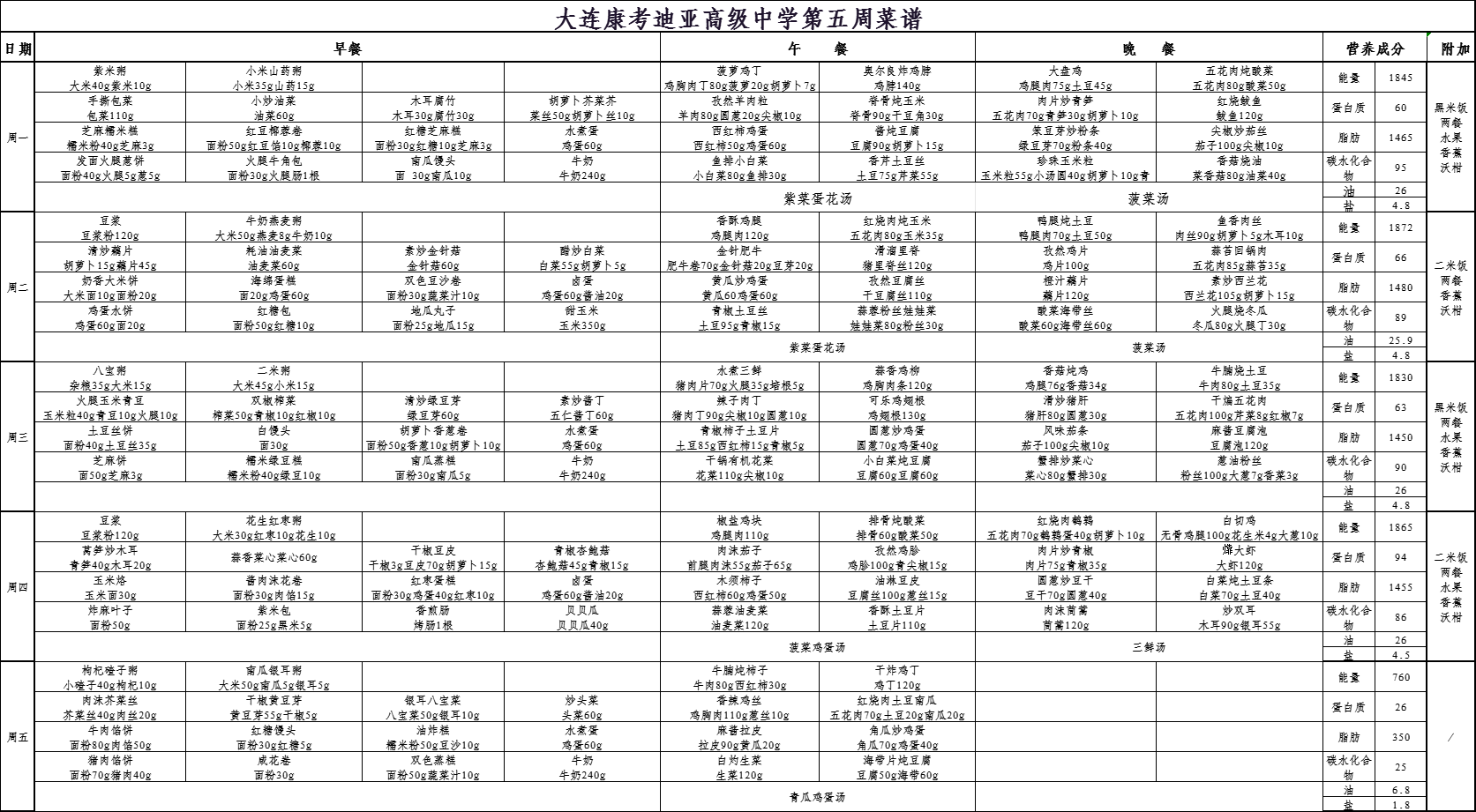 大连市康考迪亚高级中学第五周食谱(3.30-4.3)